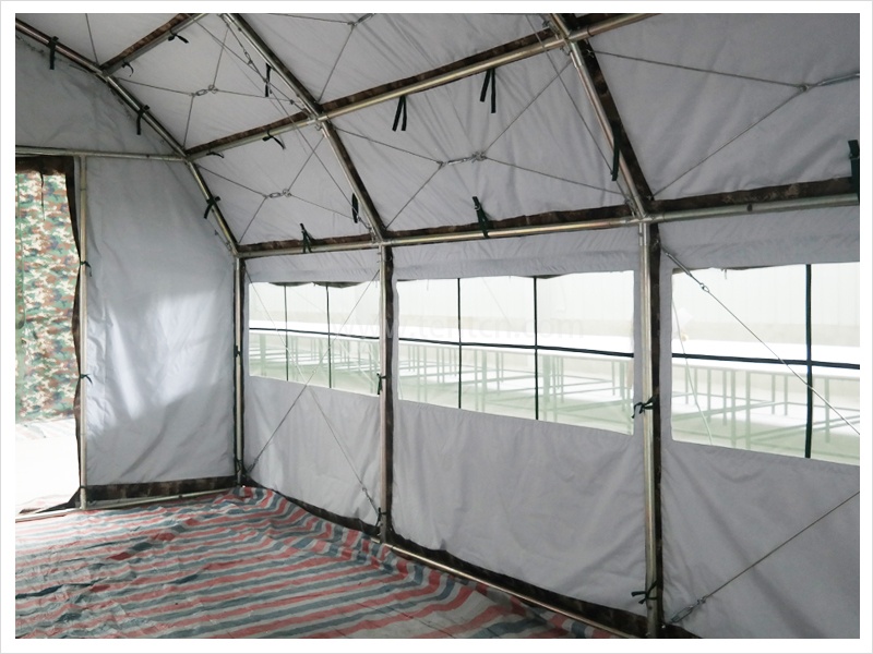 該帳篷結(jié)構(gòu)合理、空間開(kāi)闊、安全可靠。穩(wěn)定性能優(yōu)良,抗風(fēng)承載、抗雪承載能力強(qiáng)。采用套管式通頭、彈簧插銷連接,互換性強(qiáng),無(wú)需任何組裝工具即可安裝替換。篷布采用滌綸草綠(林地?cái)?shù)碼)防水帆布,里布采用本白牛津布。其在抗拉、抗撕裂、耐老化、防雨等方面性能優(yōu)良。